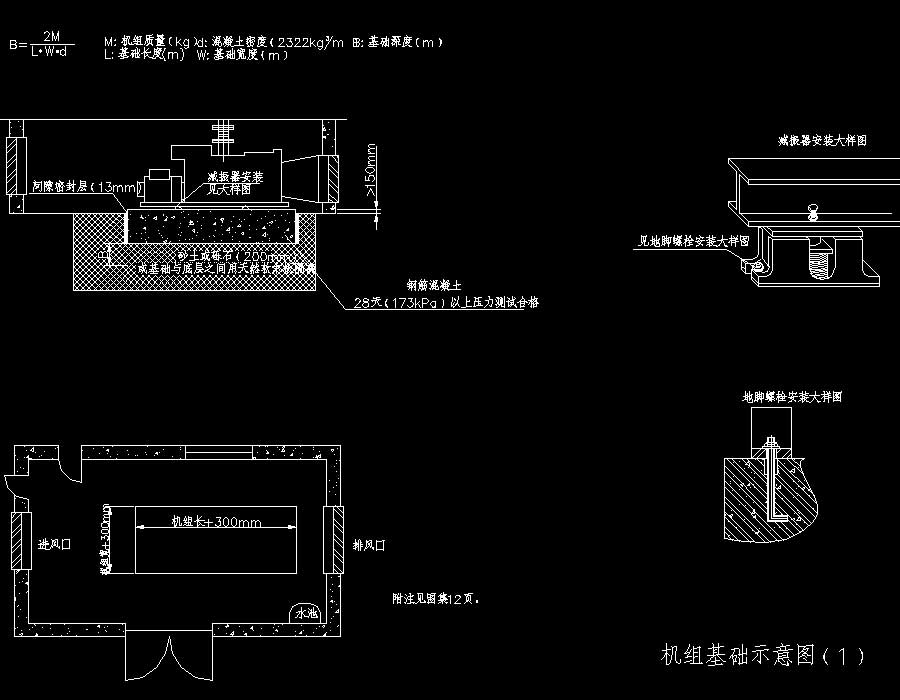 说明:该图纸为应急柴油发电机组安装详图,适用于新建、改建、扩建建筑物正常场所内安装单台、联机风冷(闭式水循环)应急柴油发电机组;发电机房设置在建筑物的首层、中间各层或地下室,连续功率为100kW—1000kW,励磁方式为无刷,相复励。本套图纸内容含:编制说明、发电机房布置图、机组基础示意图、机组冷却方式、柴油发电机组噪声源参考值、发电机房降噪方案、发电机房降噪设备布置图、发电机房噪声控制设备选型、土建型二级消声器大样图、消声器安装方式、排烟管、消声器支架安装图、消声器及排烟管隔振安装图、消声器及排烟管保温结构图、排烟管选择表、排烟管、消声器安装附注、排烟管、消声器吊架安装图、消声器吊架零件图、消声器安装附注、砖墙上保温单管导向滑动支架图、焊于柱上保温单管导向滑动支架图、滑动支架零件图、滑动支架设备材料表、低阻力消烟池示意图、百叶窗通风面积图、消声百叶窗安装示意图、观察窗安装图、机组排风筒大样图、起重吊钩、油箱 1.0立方米、人孔 Φ500、储油间示意图、发电机房、油罐管道系统图、机组控制电路图、电起动系统图、发电机励磁系统图、市电-应急机组转换电路图、发电机房设备、管道布置图、油罐设备、管道布置图、地下一层柴油机房平面图、地下一层柴油机房消防平面图、地下一层柴油机房通风示意图、机组产品性能表、机组应用图、机组产品性能表。