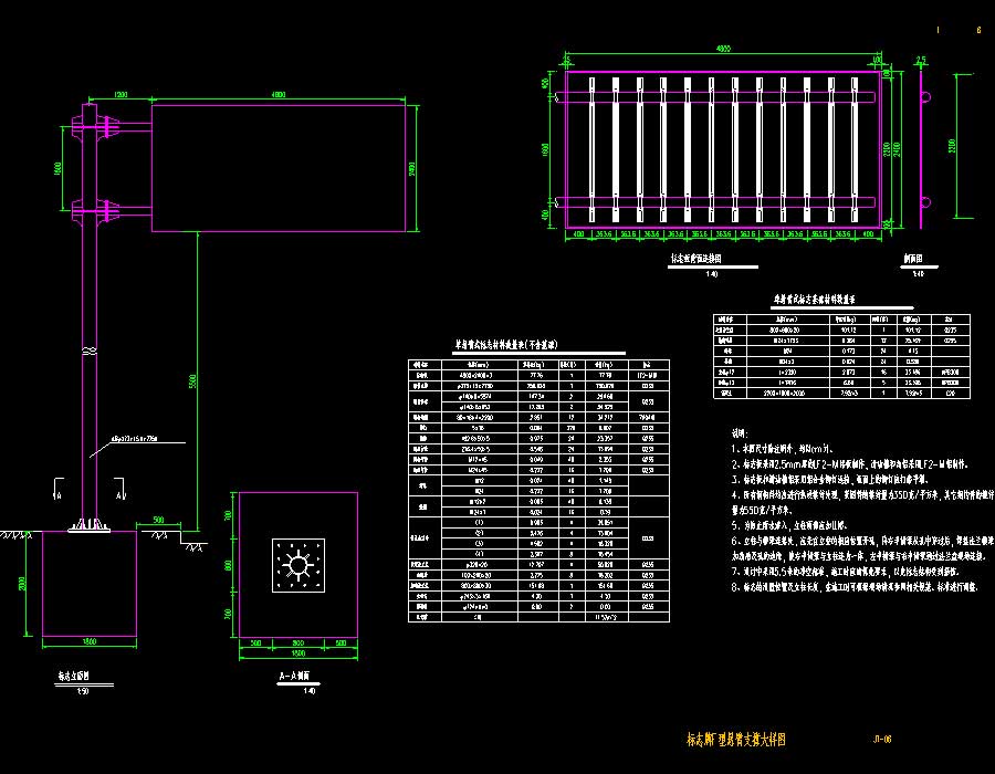 说明:地面交通标线大样图、机动车导向箭头大样图、禁令标志、两侧通行标志、导向车道标志、允许掉头标志、人行横道标志、人行横道信号灯大样图、灯杆立面大样图、信号灯基础立面图、信号灯基础平面图、电子警察杆件结构设计图、基础立面图、基础配筋立面图、基础平面图、地脚螺栓大样图、箍筋大样图、定位法兰大样图、违停抓拍安装大样图、井盖平面图、沙井剖面图、手孔井主要材料表、车行道穿线管暗敷管道剖面图、人行道穿线管暗敷管道剖面图、信号控制箱基础图、交通标志杆立面图、剖面图、标志板背面连接图、主要材料数量表、钢筋表、交通标志杆立柱与横梁连接部大样(平面、立面、侧面)、肋板大样图、横梁法兰(立面、平面)、横梁连接螺栓大样图、横梁连接螺母大样图、横梁连接垫圈大样图、立柱底连接大样图、柱帽大样图、基础钢筋大样图、底座法兰盘大样图、标志牌悬臂式支撑立面图、上法兰盘大样图、底法兰盘大样图、基础立面图、基础侧面图、基础平面图、加劲肋大样图、标志牌F型悬臂支撑立面图、剖面图、单悬臂式标志材料数量表(不含基础)、标志板背面连接图、侧面图、单悬臂式标志基础材料数量表、立柱与横梁连接部大样图、横梁加劲肋、滑动槽与标志板连接大样图、标志板边缘卷边加固大样图、剖面图、滑动槽大样图、横梁帽、柱帽大样图、螺栓、螺母、垫圈大样图、横梁帽、柱帽尺寸表、φ140横梁抱箍大样图、φ140横梁衬底大样图、单悬臂式标志基础、基础箍筋大样图、基础主筋大样图、底座连接、地脚大样图、交通标志标线大样图、钢混结构隔离墩大样图、 500*500mm隔离墩大样图、水泥隔离墩(含混凝土基座)正面图、桩座正面图、侧面图、混凝土座截面图、140直杆标杆设计图、单柱式标志材料数量表(不含基础)、单柱式标志基础材料数量表、140直杆标杆设计图、单柱式标志一般构造图、交通标志版面布置图、交通标志结构设计图等。