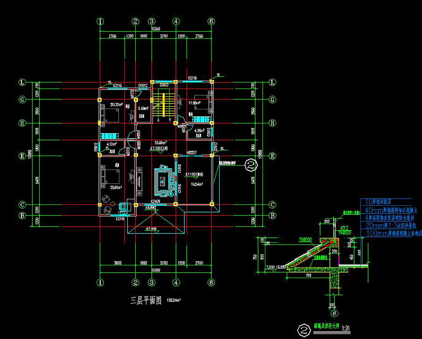 说明:本工程为地上4层,一层为大厅、厨房等,二、三、四层为卧室、卫生间等,总建筑面积为580㎡,建筑总高度13.8m(室外地面至屋顶檐口),一层层高为3.9m,二~四层层高均为3.3m,钢筋混凝土框架结构,抗震设防烈度为7度,图纸包含:建筑设计说明,平面图,立剖面图,门廊大样图,楼梯大样图,卫生间防水做法大样图;结构设计说明,基础平面布置图,基础大样,柱网平面图,柱网大样,地梁配筋图,梁、板配筋图;给排水设计说明,给排水平面图,给水、排水管道系统图,热水系统图;暖通设计说明,暖通大样图,平面图;电气设计说明,基础接地平面图,屋面防雷平面图,照明、插座、弱电平面图