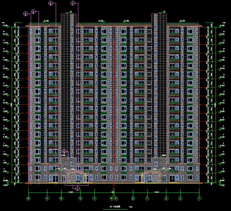 说明:某高层住宅楼多专业施工图,抗震设防烈度为6度,主要结构形式为剪力墙结构,建筑高度为53.3米,地上层数18层,地下层数为1层,地上建筑面积为10265.4平方米,地下建筑面积为544.33平方米。图纸内容含:建筑说明,多层、高层住宅空调孔K2设置原则,平面图,立面图,剖面图,楼梯大样图,门廊大样,节点大样图,门窗大样图,卫生间大样图,门窗表;给排水说明,消防给水设计总说明,消防给水平面图,消火栓给水管道系统图,给水排水通用大样图,给排水平面图,给水管道系统图,水表安装示意图,污水管道系统图,雨水管道系统图;结构说明,素混凝土刚性桩复合地基处理平面图,刚性桩复合地基处理设计说明,基础平面布置及配筋图,墙柱定位及配筋图,配筋图,结构大样图,楼梯大样图;电气说明,电气节能设计说明,电气抗震设计说明,防雷设计说明,消防电气设计说明,灯具安装、线缆敷设国标符号及穿管槽标准,塑料电线导管在墙体或现浇楼板内敷设做法大样图,配电干线竖向系统图,弱电系统图,配电箱系统图,电井布置平面图,强电干线平面图,弱电干线平面图,照明平面图,综合定位图,电气平面图,防雷接地做法大样图,总等电位及局部等电位连接做法大样图,天面防雷平面图,电梯机房接地平面图,消防系统图, 应急照明、消防平面图,消防电气平面图。专业包括建筑、结构、给排水、电气。