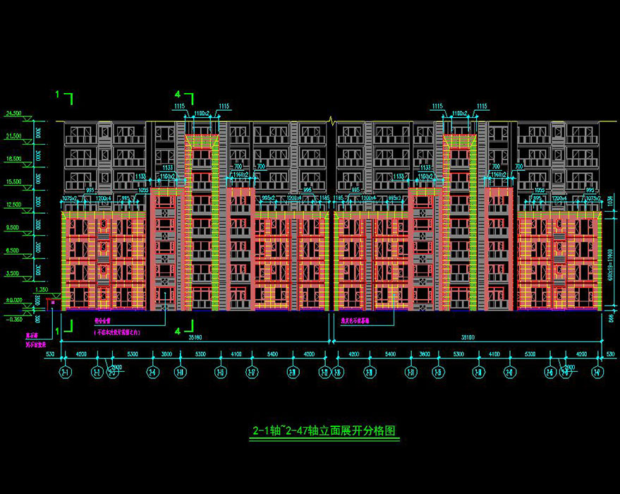 说明:本工程为某体育场地块改造项目二期1#楼地上及地下车库、2#楼幕墙工程,地上33层,建筑高度99.75m,本次幕墙设计最大高度:22.6m,图纸包含:工程设计总说明,立面展开图,1#、2#楼一层至八层平面图,地下室一二层平面图,局部大样分格图,点式雨篷分格图,石材造型大样图,1#地上剖面图、地下车库剖面图,平面埋件图,石材幕墙基本节点,石材龙骨连接节点,石材幕墙立柱连接节点,石材幕墙造型节点,A向视图,石材檐口造型节点,石材幕墙底部连接节点,石材幕墙与铝合金窗交接节点,石材幕墙与保温装饰交接节点,石材幕墙变形缝节点,铝单板造型节点,点支式雨篷基本节点,后补埋板安装节点,埋件加工图,玻璃幕墙分格大样图,门窗大样图,明框幕墙立柱节点,立柱与主体结构连接节点,横梁与立柱连接节点,铝合金地弹门上下部节点、连接节点,铝合金门连窗节点,石材幕墙顶部造型节点,石材幕墙与涂料交接节点,材料表等