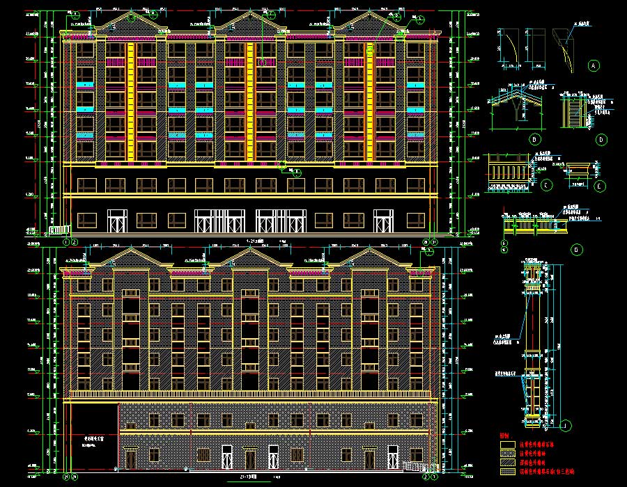 说明:某中高层商住楼建筑施工图,抗震设防烈度为6度,主要结构形式为剪力墙结构,基础形式为桩基础,建筑高度为23.55米,地上层数7层,地下层数为1层,总建筑面积为5303.52平方米,地上建筑面积为4224.86平方米,地下建筑面积为1078.66平方米。无单独地库部分图纸。图纸内容含:建筑说明,平面图,立面图,剖面图,单元放大图,楼梯大样图。