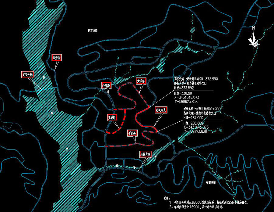说明:该大道长872.99m,道路等级为城市主干路,设计车速40千米/小时,路幅宽度34米,双向六车道,图纸包含:道路工程施工说明,工程数量表,项目区位图,道路总平面图,道路平面分图,直线、曲线及转角一览表,道路逐桩坐标表,总纵断面图,分纵断面图,竖曲线设计表,标准横断面图,典型横断面图,土方横断面图,土方工程数量表,路面结构及缘石大样图,人行道及树池布置图,防撞护栏大样图,残疾人通道大样图,人行道栏杆大样图,盲道设计图,花格植草护坡大样图,路基设计图,锚杆框格梁护坡大样图,薄层抗滑层大样图,管线过街路面加固图,检查井周围路面加固图,雨水口周围路面加固图,道路竖向设计图,软弱土路基设计图,坡顶防护网大样图,锚喷支护大样图,特殊路基处理平面图,接缝设计图,水泥隔离设施大样图;挡墙工程施工图设计说明,挡墙及高边坡护坡总体布置图,挡墙平立面布置图,挡墙地质横断面,锚杆格构护坡设计图,衡重式挡墙一般构造图,锚喷支护大样图;排水施工图说明,雨水总平面图,污水总平面图,大样图,雨水跌水井钢筋构造,井表、材料表,排水分平面处理,排水纵断面,雨水汇水面积图,综合管线横断面;道路照明施工图设计说明,道路照明施工图设计说明,设备材料表,负荷计算表、箱变系统图,道路照明标准横断面图,道路照明分平面图,道路照明灯大样图,路灯坐标表;交通工程施工图设计说明,交通工程平面图,地面标线大样图,标准路段车道布置图,交通标志版面设计图,单柱式标志杆结构设计图,交通标志杆结构设计图,纵向减速标线大样图,二次过街设施大样图,单柱式信号灯杆结构设计图,悬臂式信号灯杆结构设计图,电子警察立杆结构设计图,悬臂式信号灯杆及电子警察立杆基础图,控制机箱及基础大样图,手孔井大样图,管道敷设大样图,设备接地大样图,交通标志标志标线工程数量表,信号灯工程数量表,电子警察工程数量表,测速抓拍电子警察工程数量表等