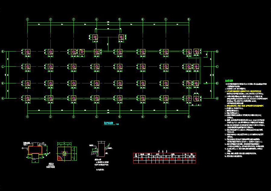 说明:本工程为机场改扩建项目,主要包含供水站、机场业务用房、空调机房、垃圾房、消防站、值班室、生产生活辅助设施工程--机场综合楼等几个子项组成,其中供水站地上1层,地下1层,结构高度为4.25m,机场业务用房地上2层,结构高度为9.4m,空调机房地上1层,结构高度为4.55m,垃圾房地上1层,结构高度为4.25m,消防站地上1层,结构高度为5.15m,值班室地上1层,结构高度为3.05m,机场综合楼地上4 1层,地下1层,建筑高度为19.4m,大门值班室采用异形柱框架结构,其余子项均采用钢筋混凝土框架结构;图纸包含:结构设计总说明、目录,桩位平面布置图,底板平面布置图,框架柱平面布置图,构架层钢柱平面布置图,结构平面布置及板配筋图,构架层平面布置图,梁平法施工图,楼梯详图等