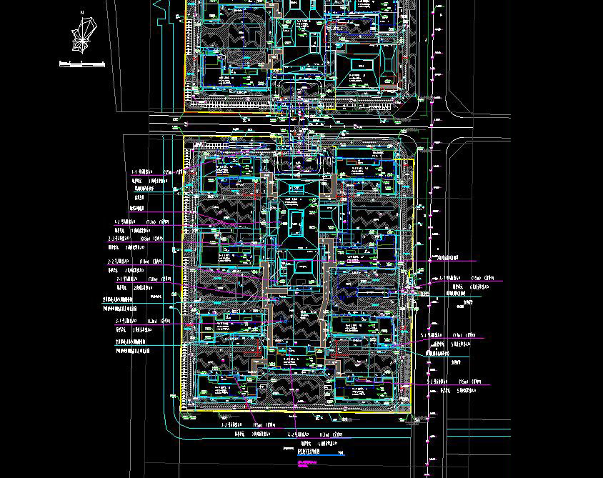 说明:该项目建设用地面积:总用地面积104130.15㎡,包含南北两个地块,其中:地块一(北地块)净用地面积约54230.85㎡,地块二(南地块)净用地面积约49899.3㎡,地块性质为商业用地。共由11栋生活单元、1栋旅居型酒店、2栋养老酒店、1栋照料单元、1栋照料单元及护理院、2栋养老配套以及1栋商业配套组成,总建筑面积264472.04㎡,其中地上建筑面积213525.04㎡,地下建筑面积50947㎡,机动车总停车位948辆,其中充电桩车位191辆,非机动车总停车位2083辆,地下室为一层,主要为汽车库、自行车库、设备用房及后勤配套等功能。其中:1#生活单元地上11层,建筑高度37.4m,建筑面积11239.98㎡,2#生活单元地上14层,建筑高度47.3m,建筑面积13472.65㎡,3#照料单元地上12层,建筑高度40.7m,建筑面积12796.94㎡,4#照料单元及护理院地上11层,建筑高度43.3m,建筑面积19351.69㎡,5#养老酒店地上14层,建筑高度47.3m,建筑面积14526.49㎡,6#养老酒店地上12层,建筑高度40.7m,建筑面积13936.52㎡,7#旅居型酒店地上19层,建筑高度70.55m,建筑面积17291.68㎡,9#养老配套地上2层,建筑高度12.6m,建筑面积5352.24㎡,10#养老配套地上3层,建筑高度16.65m,建筑面积8278.99㎡,11、13、17、19#生活单元地上14层,建筑高度49.2、47.3m,建筑面积12358.01~14112.34㎡,12、18#生活单元地上12层,建筑高度40.7m,建筑面积11808.45、11788.14㎡,14~16#生活单元地上7层,建筑高度24m,建筑面积5944.6~6073.26㎡,钢筋混凝土剪力墙结构,门卫1~5地上1层,建筑高度7.6、4m,建筑面积15.37~41.83m,图纸包含:建筑、结构、给排水、暖通、电气、装配式设计、幕墙、厨房工艺、标识、交通划线、弱电智能化、景观、泛光以及部分建筑室内装修(缺8#商业配套楼施工图)