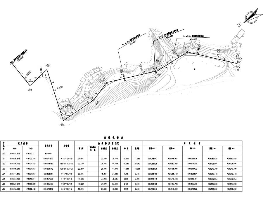 说明:该项目为某县三溪至楚阳畅通工程(三溪大桥至高铁渣场段)一阶段施工图,路线全长2.768km,公路技术等级:农村公路,设计速度: 15Km/h,路基宽度: 7.0m,计使用年限:沥青混凝土路面8年。图纸内容含:总说明、项目地理位置图、主要经济技术指标表、路线说明、路线平面图、路线纵断面图、直线、曲线及转角表、纵坡、竖曲线表、公路用地表、公路用地图、拆迁建筑物数量表、砍树挖根数量表、拆迁电力电讯表、路线逐桩坐标表、安全设施工程数量表、标志布设一览表、波形梁护栏一览表、安全设施设计图、路基、路面说明、路基设计表、路基标准横断面图、一般路基设计图、路基横断面设计图、超高方式图、路基土石方数量表、路基每公里土石方数量表、路基防护工程数量表、路基防护标准图、路基防护工程设计图、路基支挡数量表、路基支挡、防护工程设计图、主动防护网工程数量表、主动防护网标准图、路面加宽表、路面工程数量表、路面结构图、路基排水工程数量表、路基路面排水工程设计图、涵洞说明、涵洞工程数量表、涵洞设计图、涵洞设计通用图、交叉说明、平面交叉工程数量表、平面交叉布置图、搭接设置及工程数量表、搭接通用设计图、环境保护说明、其他工程说明、人行梯步工程数量表、梯步构造图、筑料说明书、沿线筑路材料料场表、施工组织说明、临时工程数量表。