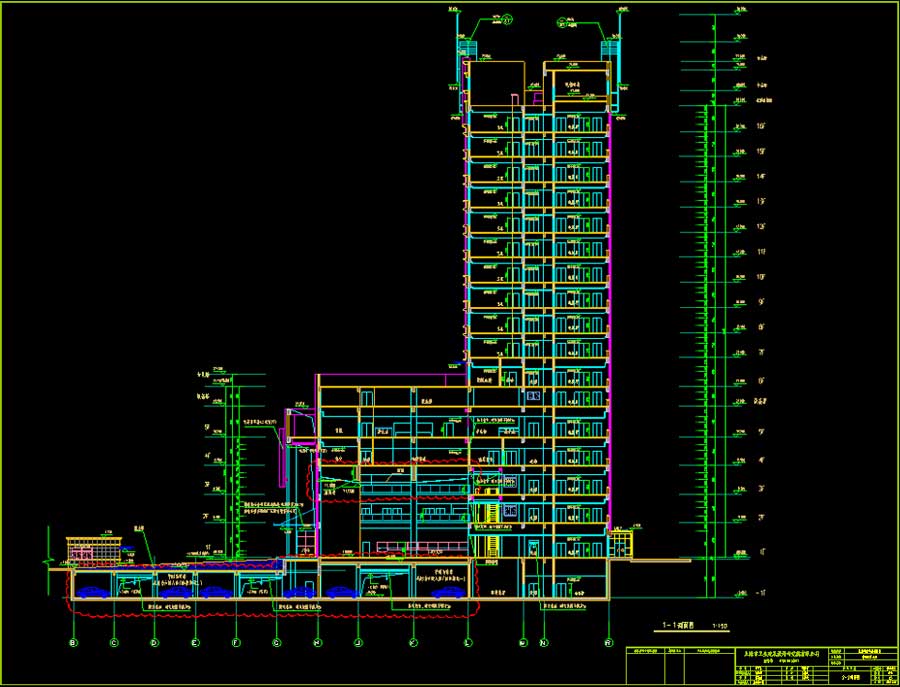说明:本工程为铁法煤业集团总医院医疗综合大楼,面积五万多平方米。地下一层至地上十六层:地下一层为人防、变电所、车库等设备用房,底层为急诊抢救、药房、挂号收费、放射科、消防安保等。二、三层为门诊,四层为中心检验、中心供应,五层为手术室、ICU、输血科,六层为血透、中心药物配置中心,七层~十六层为病房。内容含建筑、结构、给排水、暖通、电气全套施工图